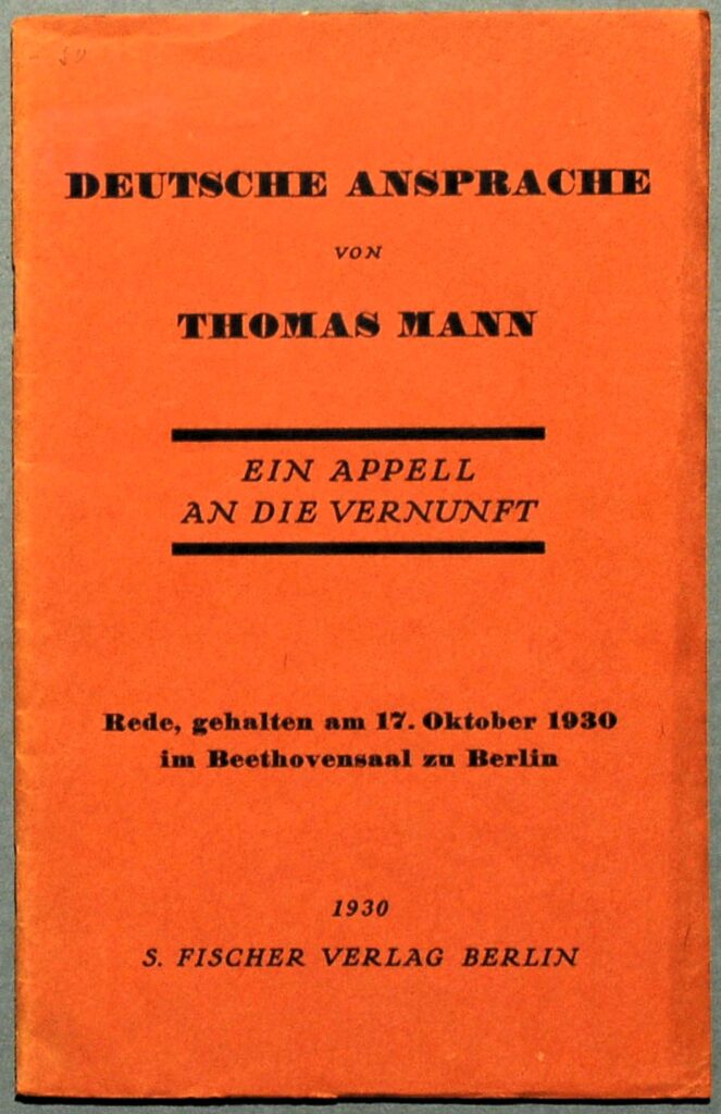 Beunruhigt durch das Ergebnis der Reichstagswahlen im September 1930, bei der die NSDAP zur zweitstärksten Kraft gewählt wurde, warnte Thomas Mann am 17. Oktober vor 95 Jahren im Beethoven-Saal in der Alten Philharmonie Berlin in seiner Rede Deutsche Ansprache. Appell an die Vernunft vor den Nationalsozialisten. Die Rede gilt als eine der wichtigsten politischen Äußerungen des bekannten Schriftstellers.